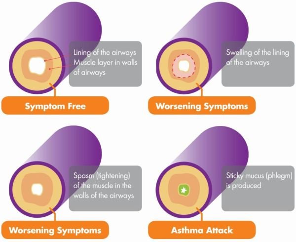 When asthma symptoms are triggered, the muscles around the walls of the airways tighten, making them narrow. The lining of the airways also swells and sticky mucous is produced, clogging up the already narrowed airways. With the airways narrow and clogged with mucous, it becomes difficult to breathe.